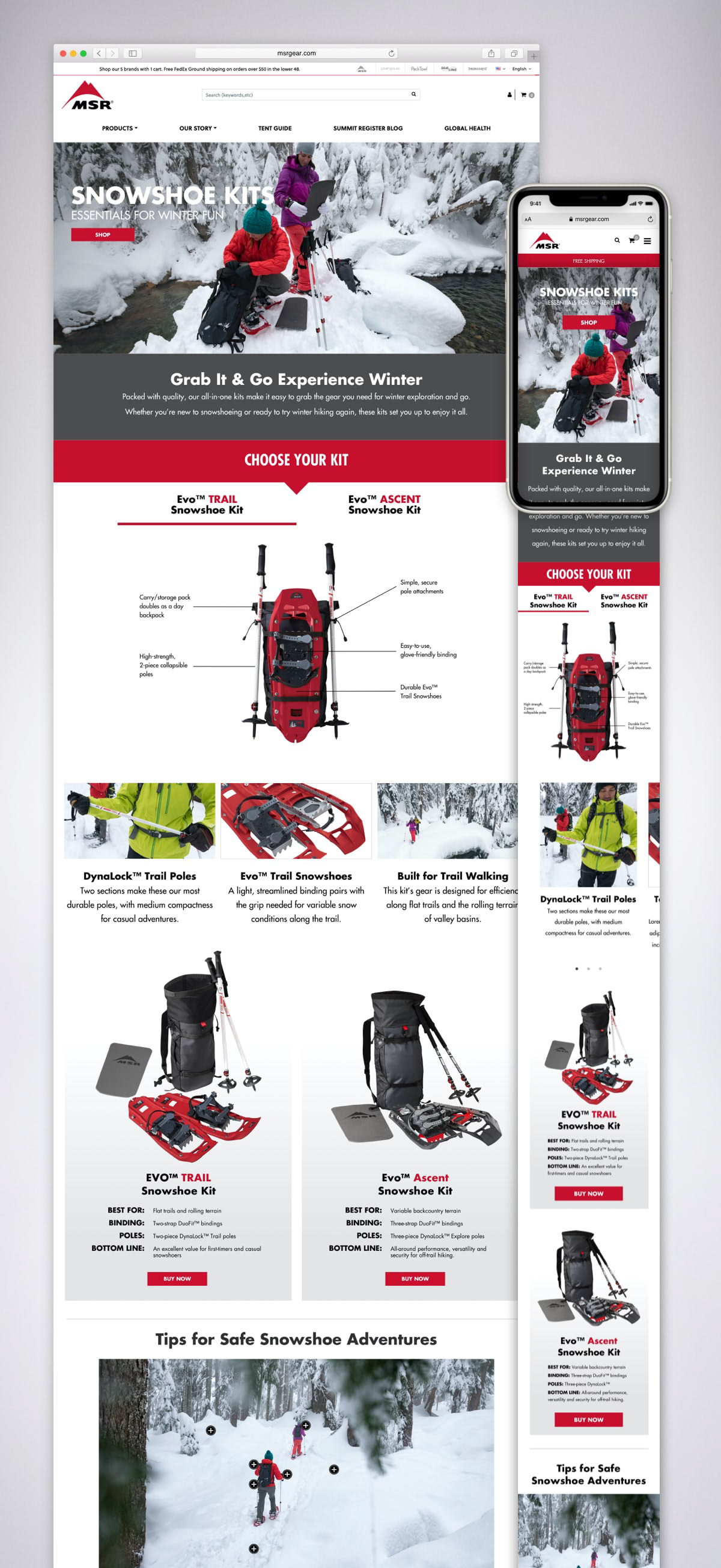 I created a product landing page aimed at enhancing the consumer experience in selecting a Snowshoe Kit from MSR, which includes two styles: the Evo Trail Kit and the Evo Ascent Kit. Comparing the use modes and features of each kit was challenging on the individual product pages. As a solution, this guide offers a clear and concise overview to facilitate a side-by-side comparison. Additionally, the page includes easily accessible resources for consumers to educate themselves on snowshoeing safety.